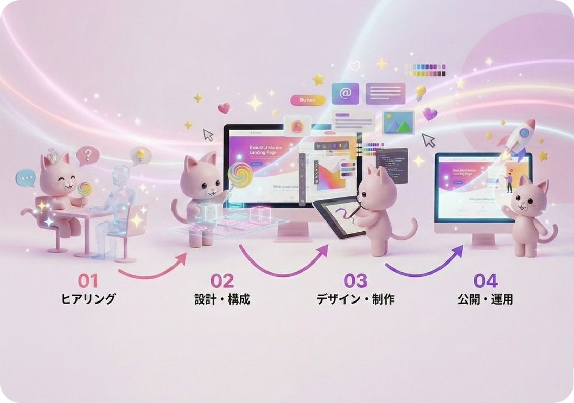プロジェクトの規模によりますが、標準的なホームページ制作の流れとしましては、戦略設計から公開まで約2〜3ヶ月を目安としています。最短での公開を目指し、透明なスケジュール管理を行います。